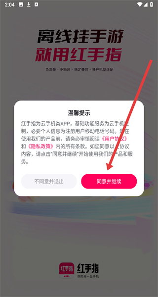 1、打開紅手指APP,彈出溫馨提示窗口,點擊同意并繼續(xù)按鈕。