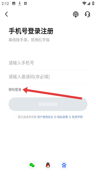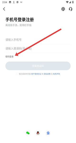 2、進入手機號登錄注冊頁面,若選擇密碼登錄,點擊密碼登錄選項,進入賬號密碼登錄界面。