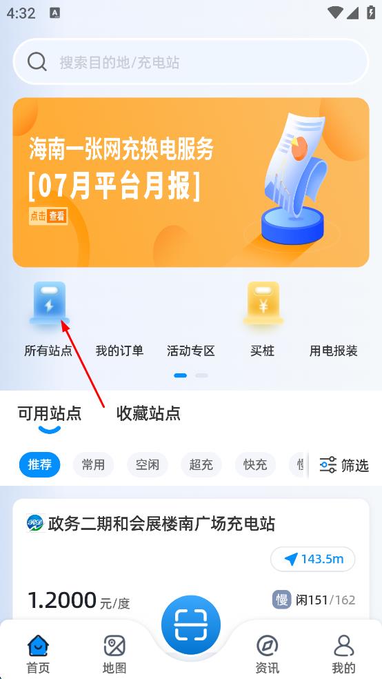 1、打開充電服務(wù)軟件,點(diǎn)擊首頁(yè)“所有站點(diǎn)”圖標(biāo),進(jìn)入站點(diǎn)列表頁(yè)面,可查看推薦、常用等分類站點(diǎn)。
