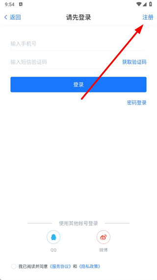 3、在登錄頁面,點(diǎn)擊右上角注冊,進(jìn)入注冊頁面。