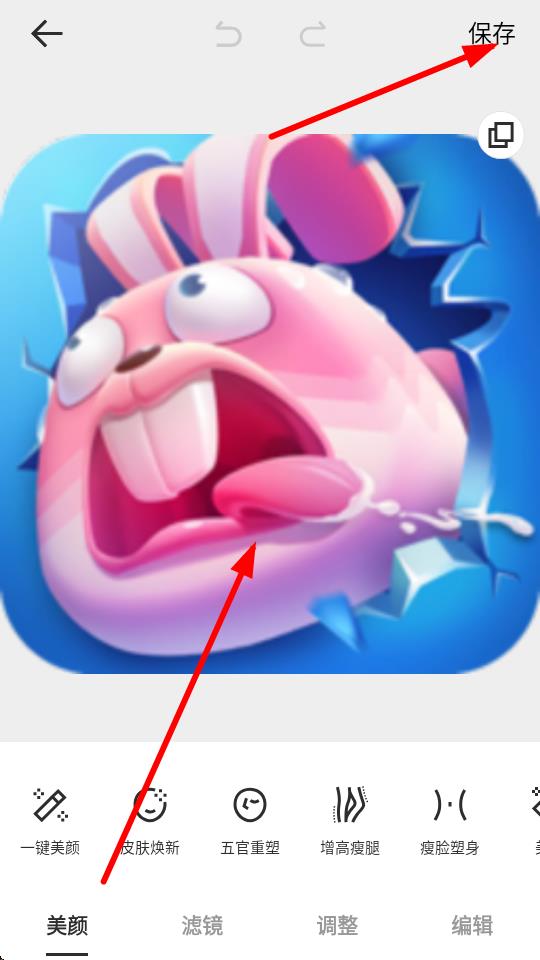 3、使用一鍵美顏等功能修圖后,點(diǎn)擊右上角保存完成操作。