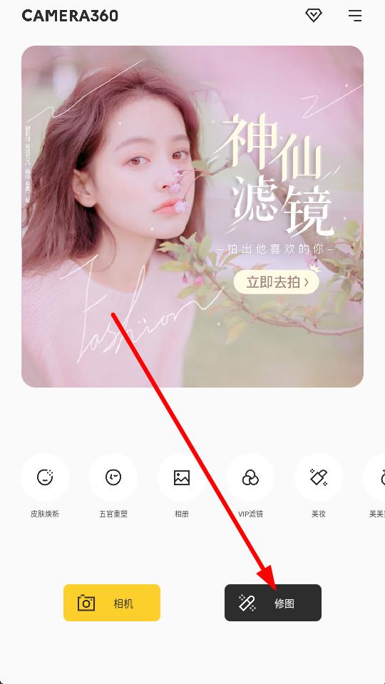 1、打開CAMERA360,點(diǎn)擊下方修圖按鈕進(jìn)入修圖流程。