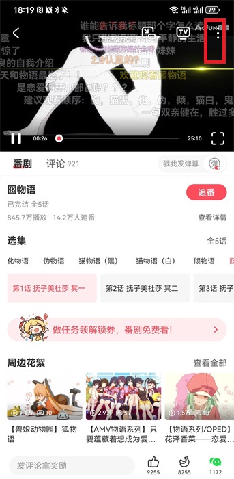 3、在播放界面中,點擊播放界面右上角的【...】就可以找到關(guān)于番劇更多的播放設(shè)置;