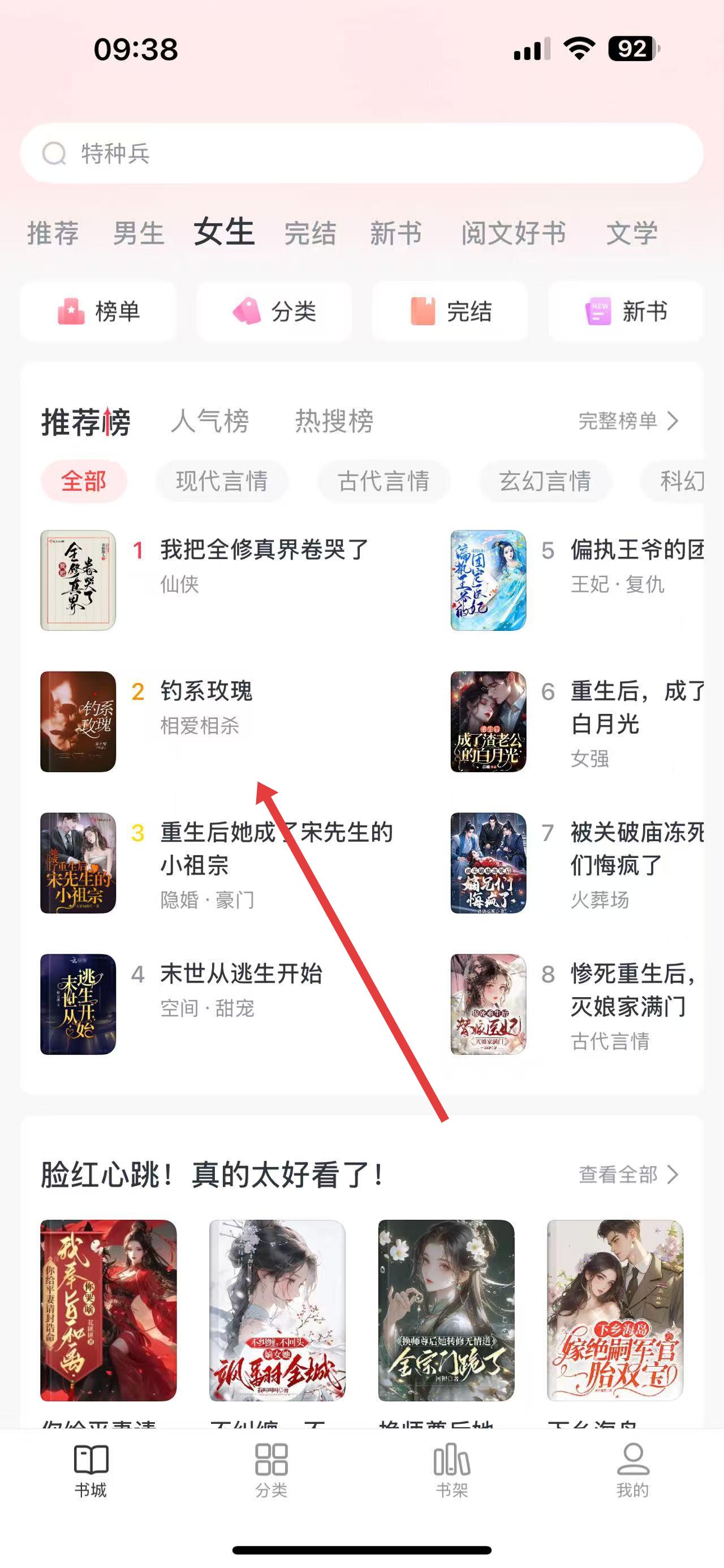 1、打開全本免費(fèi)閱讀器進(jìn)書城,在推薦榜選釣系玫瑰這類小說并點(diǎn)擊。