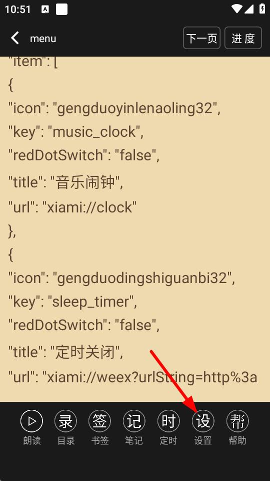 2、在文檔閱讀界面中,點擊屏幕調出底部功能欄,然后點擊設置選項。
