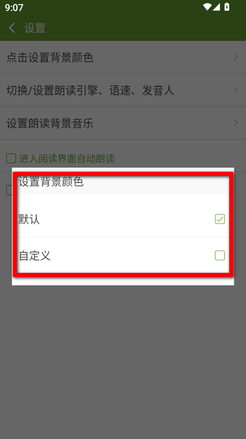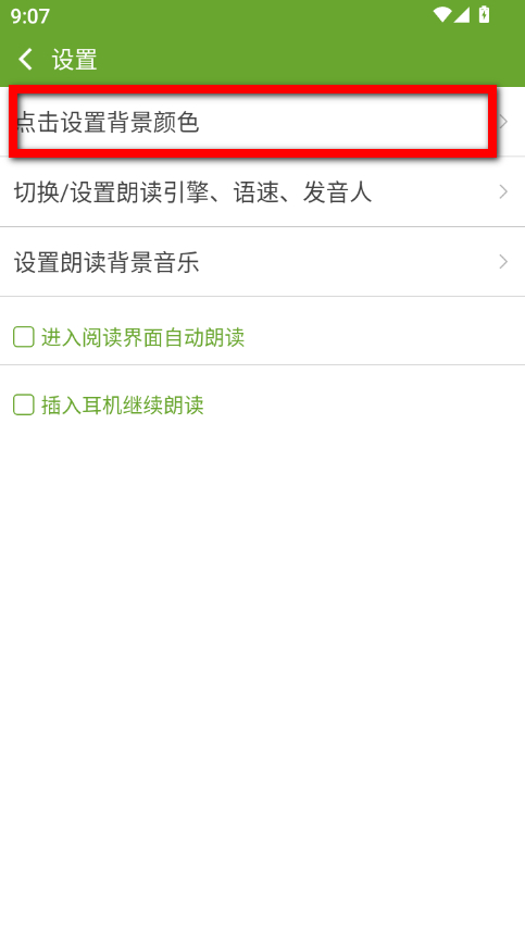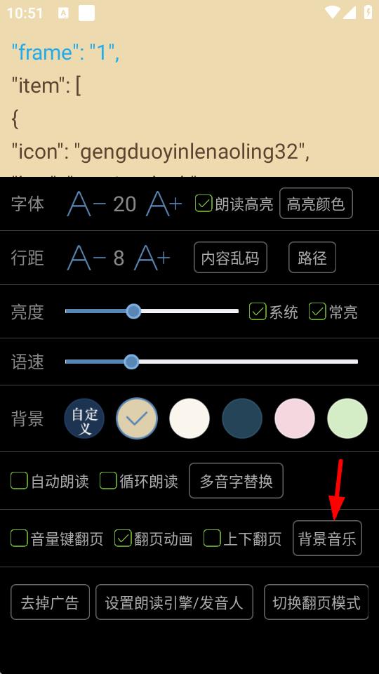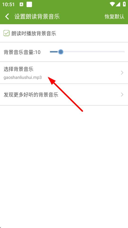 3、在設置界面里,找到并點擊背景音樂選項,進入設置朗讀背景音樂頁面。