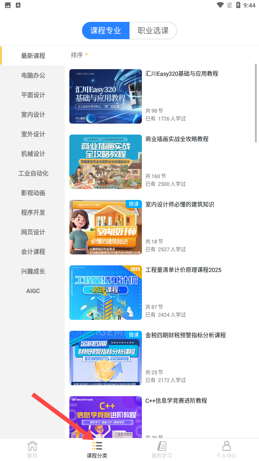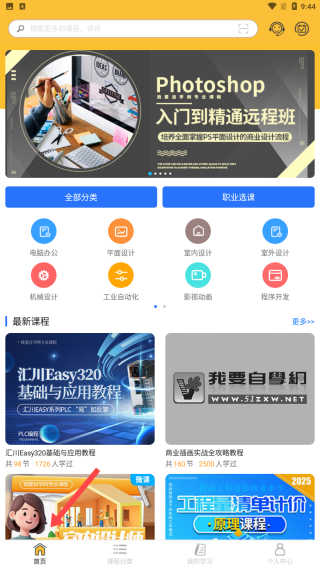 2、點(diǎn)擊課程分類,呈現(xiàn)豐富課程,覆蓋電腦辦公、平面設(shè)計等多領(lǐng)域,如匯川Easy320基礎(chǔ)與應(yīng)用教程等課程,可按需篩選學(xué)習(xí)內(nèi)容。