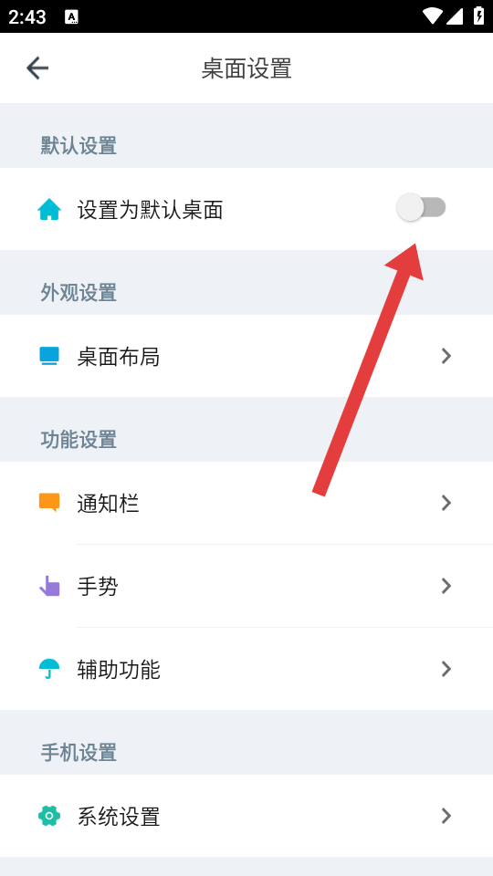 3、在桌面設置頁面,找到設置為默認桌面的選項,點擊其右側的開關。