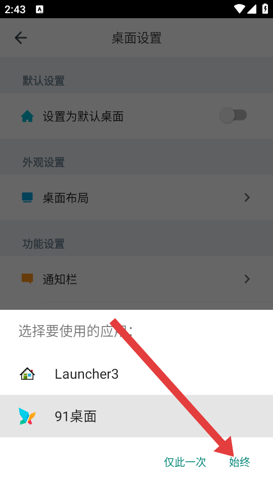 4、彈出選擇要使用的應用窗口后,選擇91桌面,并點擊始終按鈕,即可將91桌面設置為默認桌面。