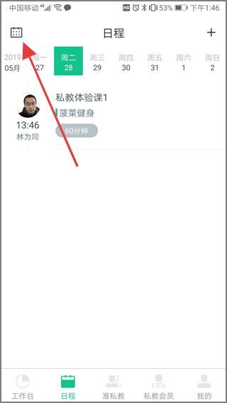 1、打開菠菜教練APP,點(diǎn)擊底部日程,進(jìn)入日程頁面。