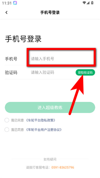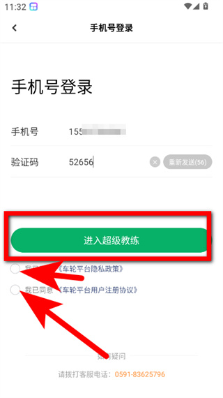 3、輸入收到的驗證碼,勾選同意相關協(xié)議后點擊進入超級教練按鈕,即可完成手機號登錄操作。