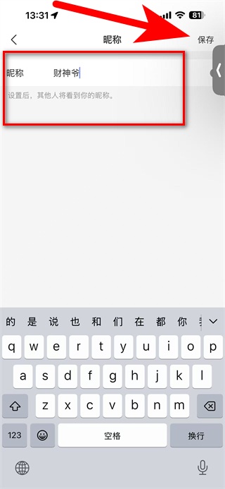 4、在昵稱修改頁面輸入新的昵稱如財神爺,點擊保存,即可完成支付寶昵稱修改。