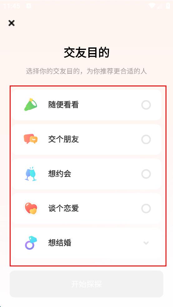 4、設(shè)置好性別后,進(jìn)入交友目的選擇頁(yè)面,在“隨便看看”“交個(gè)朋友”“想約會(huì)”“談個(gè)戀愛(ài)”“想結(jié)婚”等選項(xiàng)里,挑選符合自己交友需求的目的。