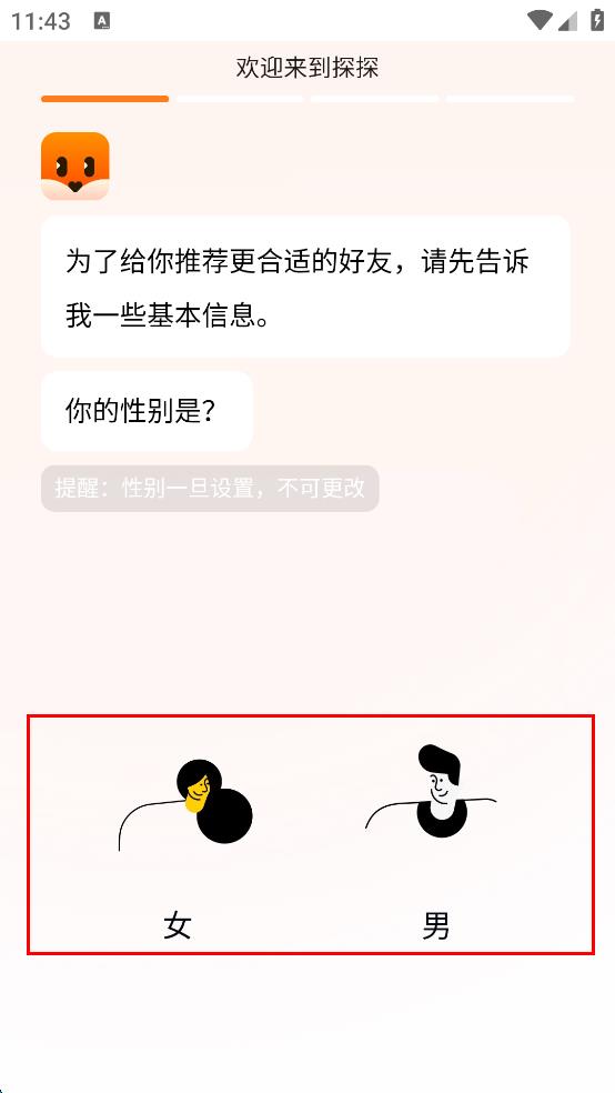 3、完成登錄后,進(jìn)入信息設(shè)置頁(yè)面,首先需要設(shè)置性別,根據(jù)自身情況,在“女”和“男”選項(xiàng)中選擇其中一個(gè)。