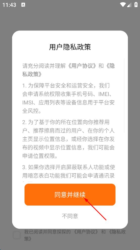 1、打開(kāi)探探APP,彈出用戶(hù)隱私政策提示,認(rèn)真閱讀相關(guān)內(nèi)容后,點(diǎn)擊“同意并繼續(xù)”按鈕,進(jìn)入登錄界面。