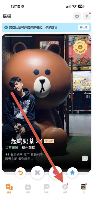 1、打開(kāi)探探APP,點(diǎn)擊底部導(dǎo)航欄中的發(fā)現(xiàn),進(jìn)入發(fā)現(xiàn)頁(yè)面。