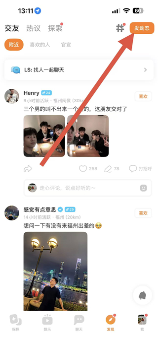 2、在發(fā)現(xiàn)頁(yè)面中,點(diǎn)擊右上角的發(fā)動(dòng)態(tài)按鈕,進(jìn)入動(dòng)態(tài)編輯頁(yè)面。