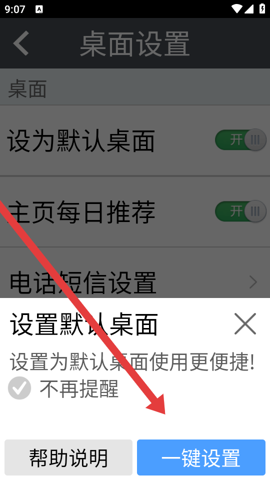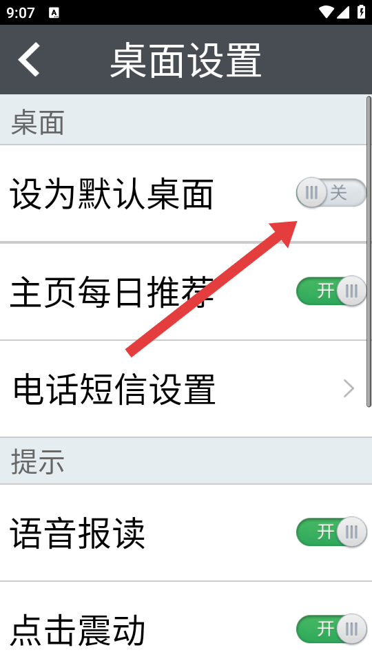 3、在桌面設(shè)置的頁(yè)面,找到設(shè)為默認(rèn)桌面選項(xiàng),需要點(diǎn)擊其右側(cè)的開(kāi)關(guān)。