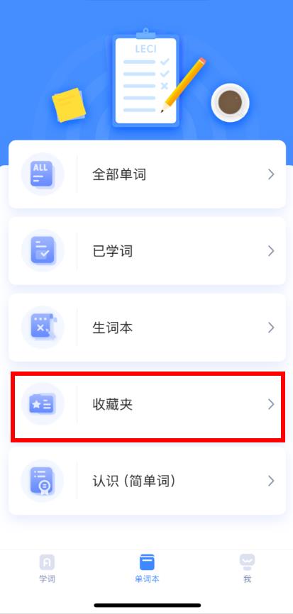 2、在單詞本頁(yè)面里,找到并點(diǎn)擊收藏夾選項(xiàng)。