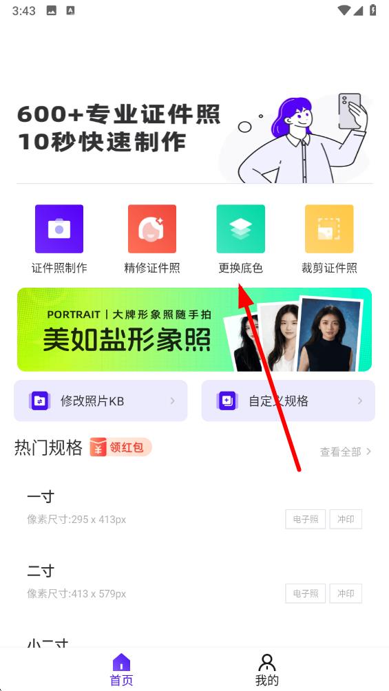 1、打開最美證件照制作app,點(diǎn)擊更換底色功能按鈕,進(jìn)入圖片上傳界面。