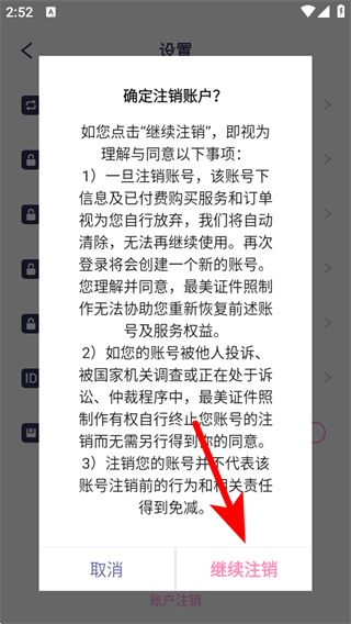 4、在提示框中,點(diǎn)擊繼續(xù)注銷按鈕,按照提示完成賬號注銷操作。