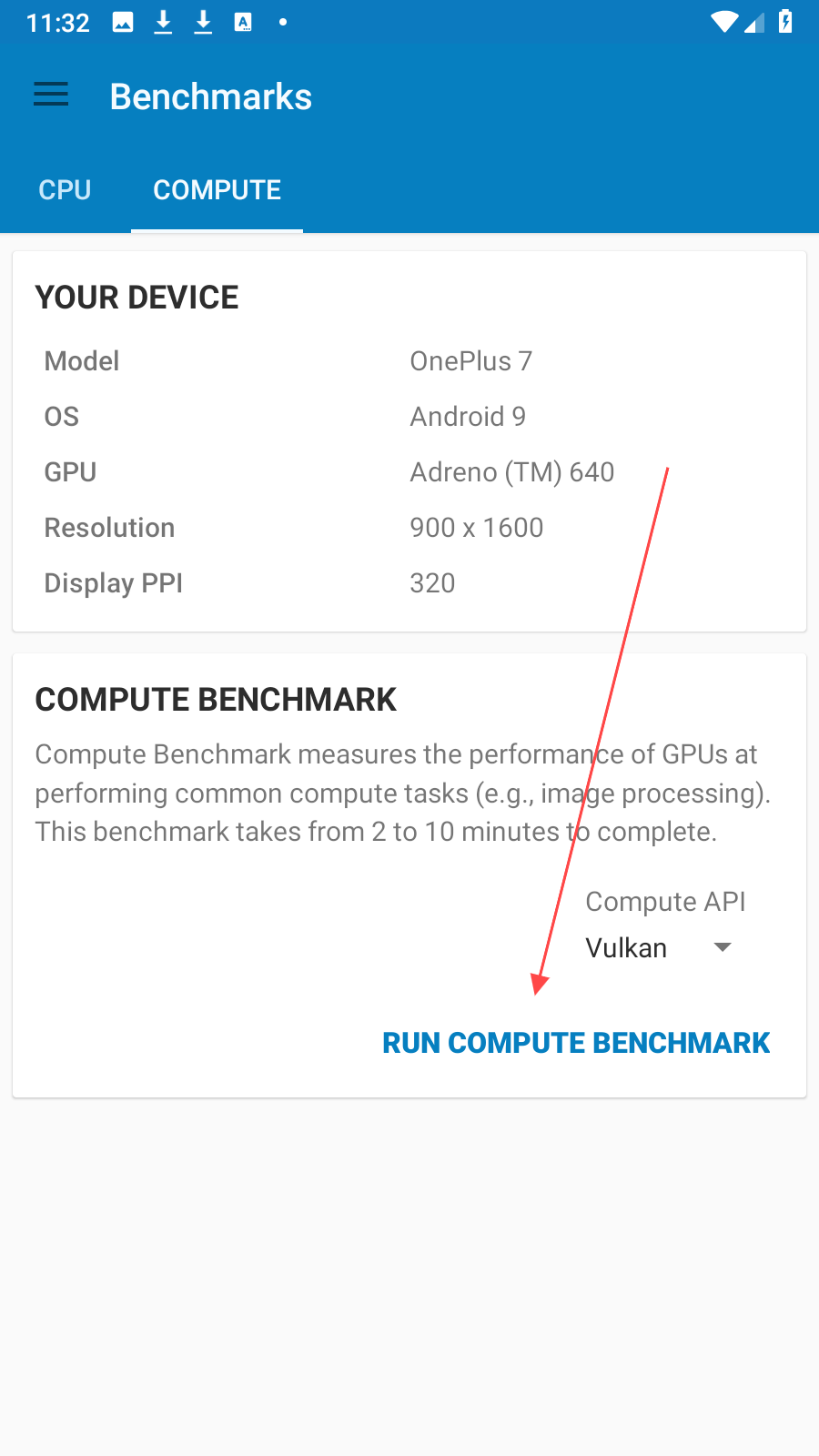 2、在Benchmarks測試界面中,點擊COMPUTE標簽,這里展示設備GPU、分辨率等信息,點擊RUN COMPUTE BENCHMARK進行GPU計算性能測試,該測試大概需要2-10分鐘。