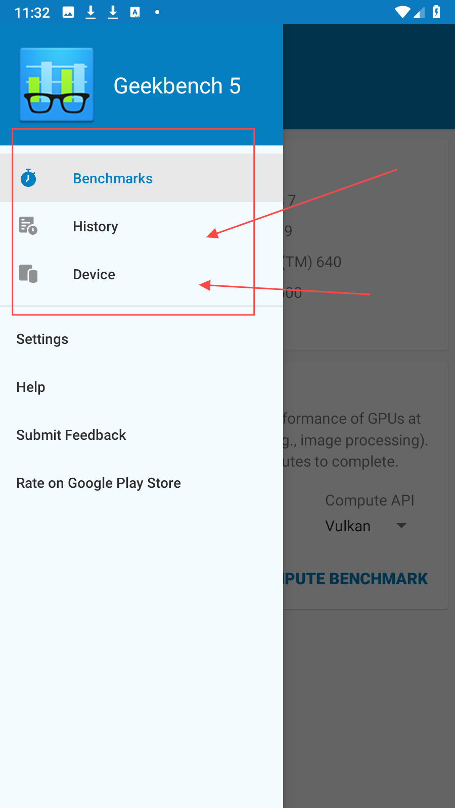 3、再次點擊左上角菜單圖標,History可查看過往測試記錄,方便對比設備不同時期性能,選擇Device能詳細查看設備硬件信息,通過這些功能可以更好地管理和了解設備性能情況。
