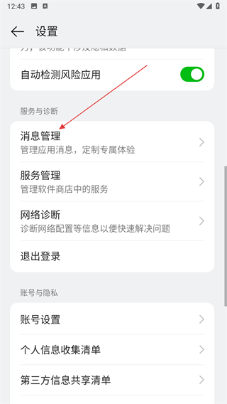 3、在設(shè)置界面中找到消息管理選項(xiàng),點(diǎn)擊該選項(xiàng)。