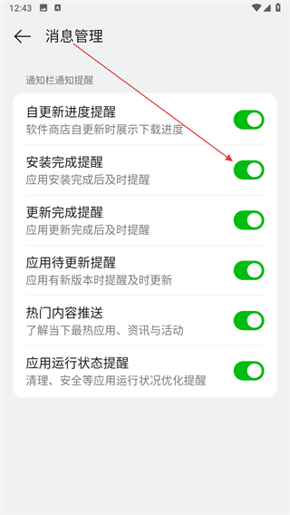 4、找到安裝完成提醒對(duì)應(yīng)的開(kāi)關(guān)按鈕,點(diǎn)擊開(kāi)啟即可。