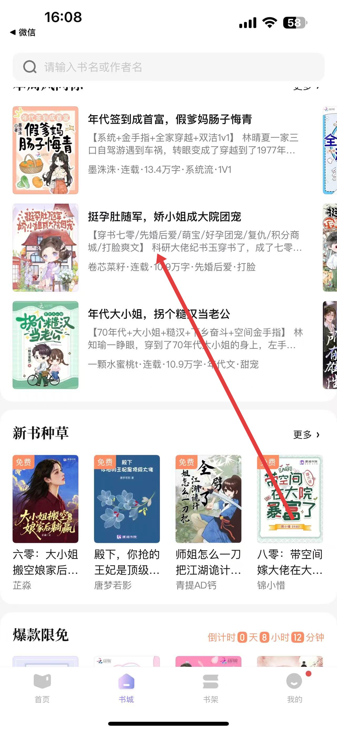 1、打開瀟湘書院APP,在書城界面選中心儀小說,如挺孕肚隨軍,嬌小姐成大院團(tuán)寵,進(jìn)入小說詳情頁。
