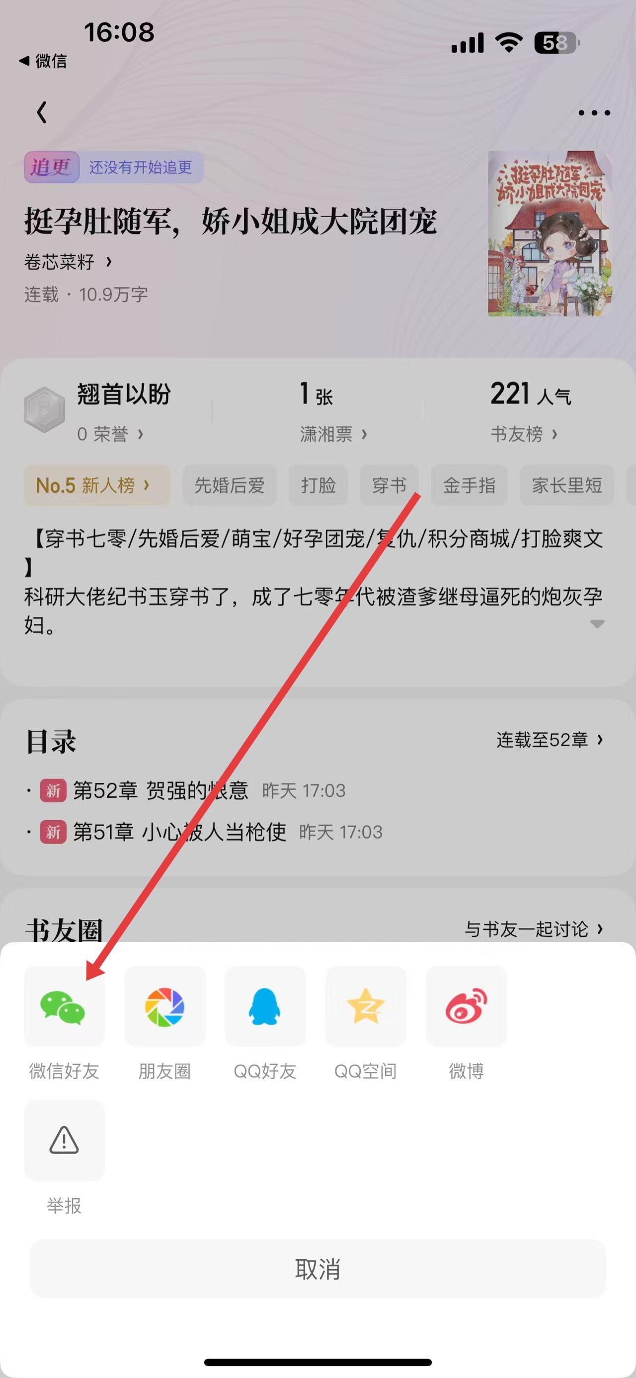 3、在彈出的分享選項(xiàng)里,選擇微信好友,即可將該小說分享至微信。