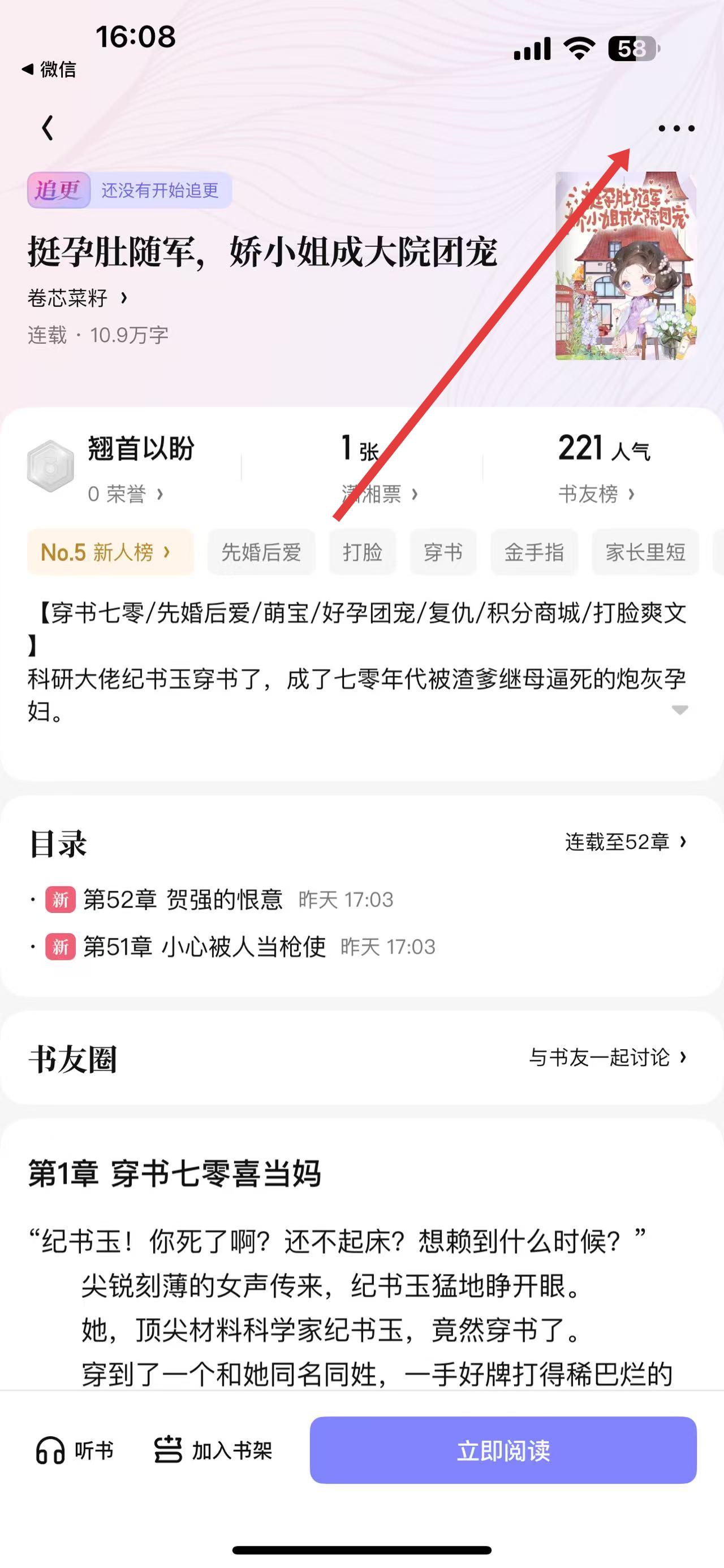 2、在小說詳情頁右上角,點(diǎn)擊三點(diǎn)圖標(biāo),調(diào)出分享等功能選項(xiàng)。