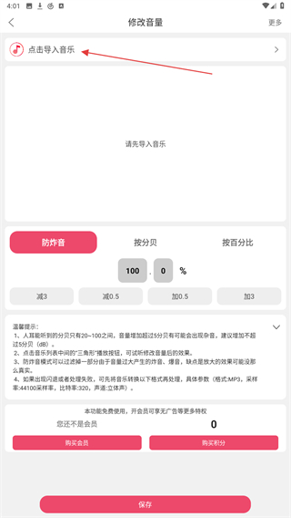 3、在修改音量的界面內(nèi),點擊導(dǎo)入音樂的按鈕。