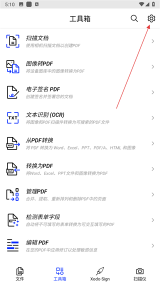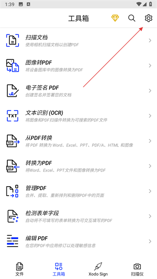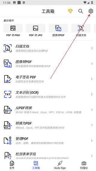 1、打開Xodo應用,進入工具箱界面,點擊右上角的設(shè)置圖標。