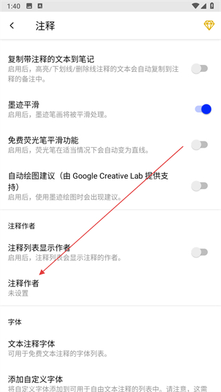 4、進入注釋設(shè)置頁面,找到注釋作者選項,點擊該選項。
