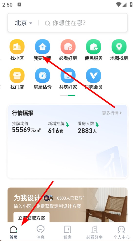 1、打開鏈家APP,進(jìn)入首頁,找到并點擊我要出租選項。