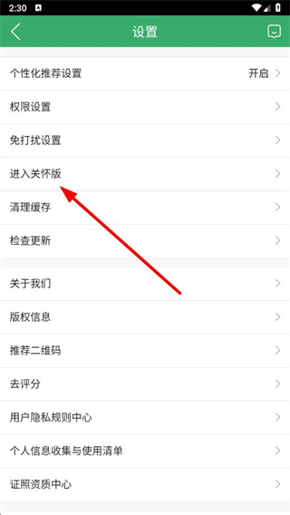 3、在設(shè)置頁面中,找到進(jìn)入關(guān)懷版選項并點擊,即可切換至關(guān)懷模式界面。