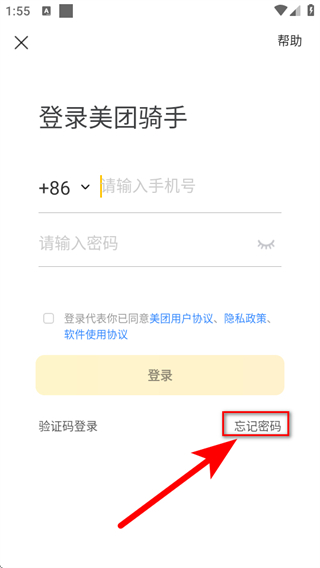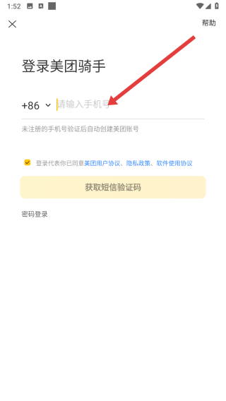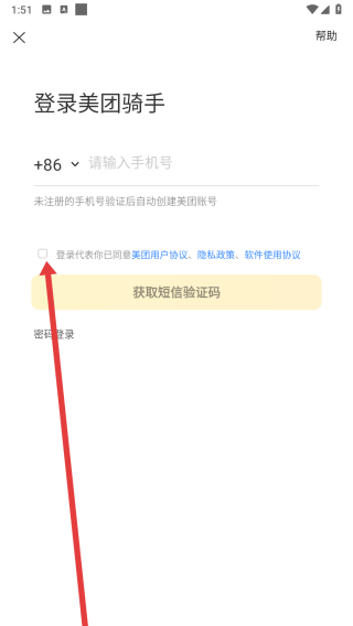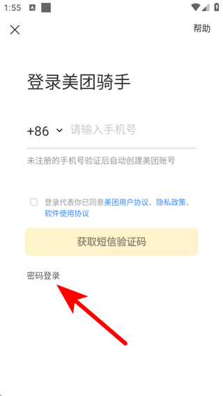 1、打開美團(tuán)騎手APP,在登錄的頁面需要點(diǎn)擊密碼登錄。