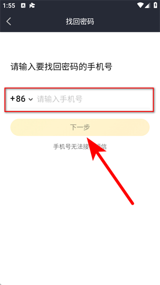 3、在找回密碼頁面,輸入要找回密碼的手機(jī)號(hào),點(diǎn)擊下一步。