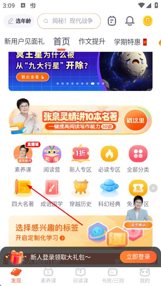 1、打開(kāi)少年得到App,進(jìn)入首頁(yè),點(diǎn)擊四大名著。