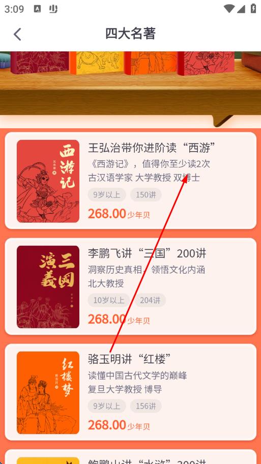 2、進(jìn)入四大名著頁(yè)面后,選擇想要收聽(tīng)的名著內(nèi)容,比如王弘治帶你進(jìn)階讀西游。