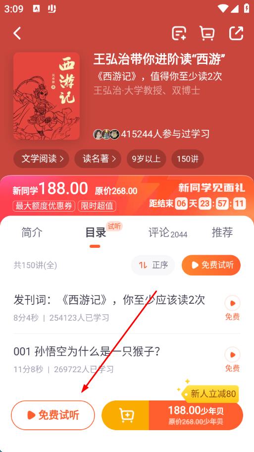 3、點(diǎn)擊進(jìn)入該名著的詳情頁(yè)面,在下方找到免費(fèi)試聽(tīng)按鈕,點(diǎn)擊它。