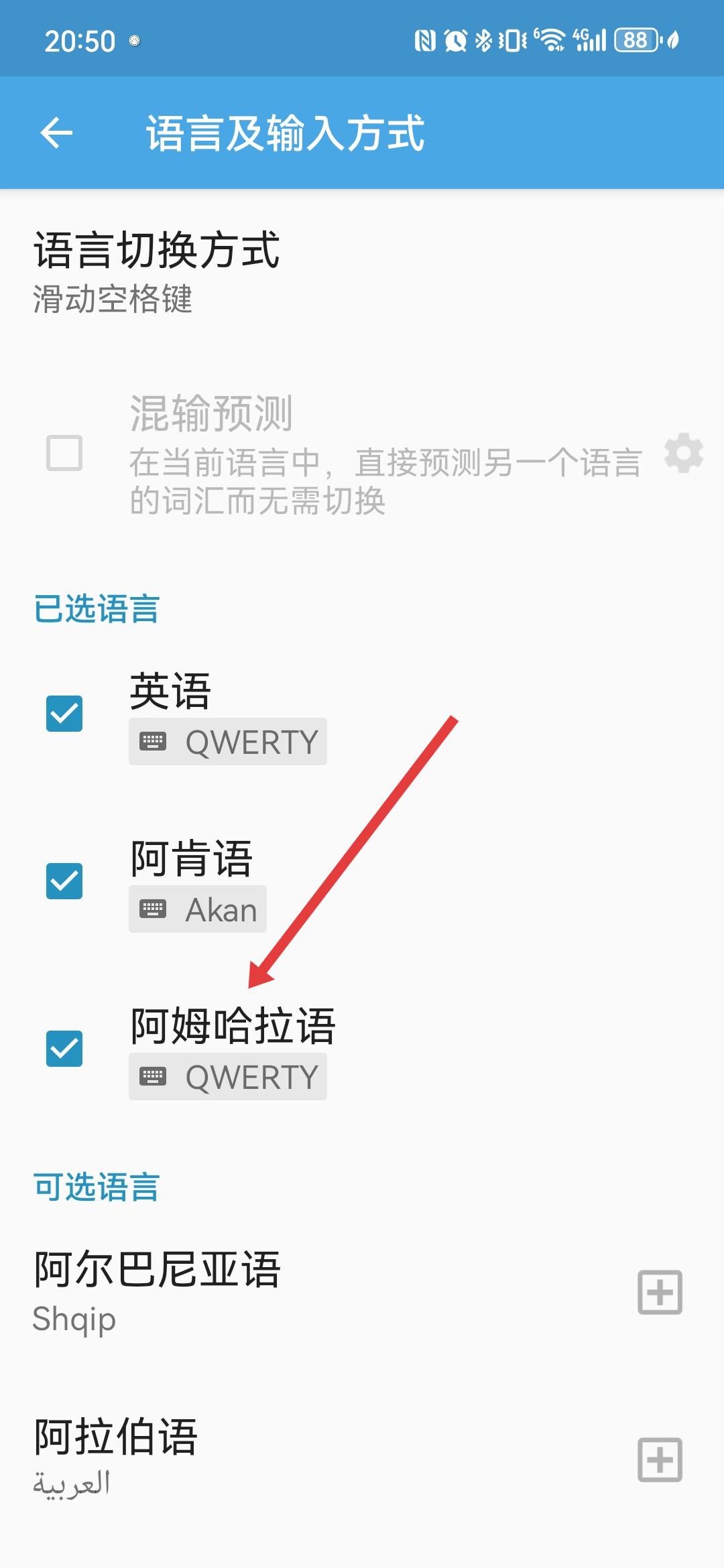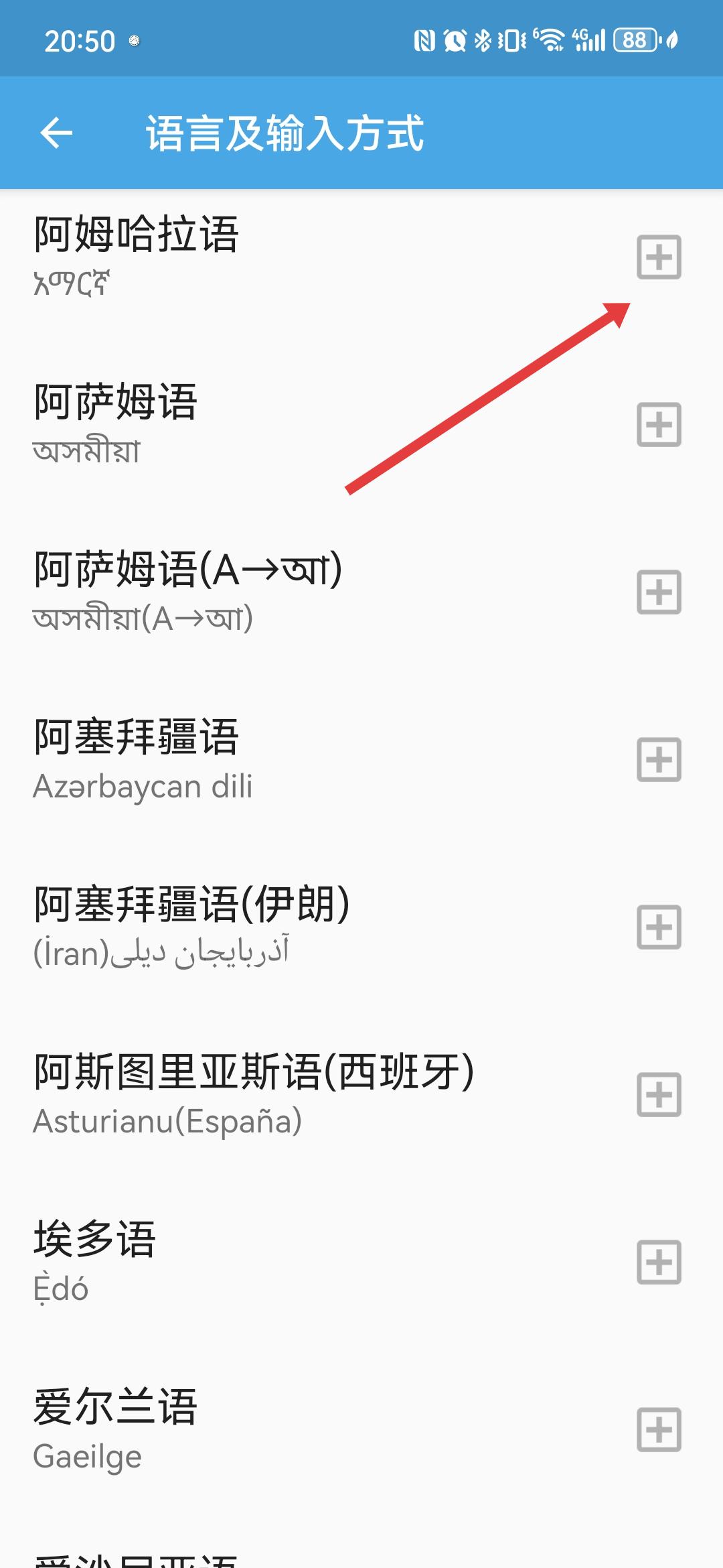 3、在語言及輸入方式頁面,找到需要添加的語言如阿姆哈拉語,點擊其右側(cè)的+號按鈕。