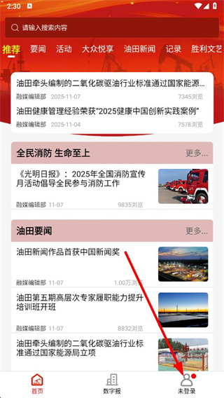 1、在勝利職工e家首頁,點擊右下角未登錄進入賬號登錄頁面。