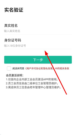 3、在實名驗證頁面,輸入真實姓名和身份證號碼,勾選同意協(xié)議后點擊下一步完成激活。