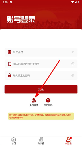 2、在賬號登錄頁面,點擊會員激活選項進入激活流程。