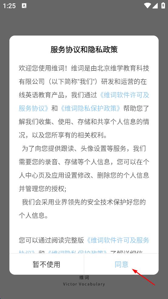 1、打開(kāi)維詞APP,在彈出的服務(wù)協(xié)議和隱私政策提示框中,點(diǎn)擊“同意”按鈕。