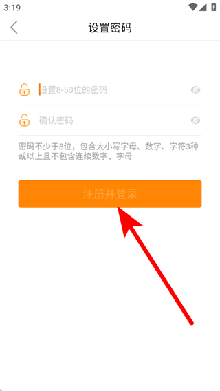 3、進入設置密碼頁面,設置密碼點擊注冊并登錄,完成注冊操作。