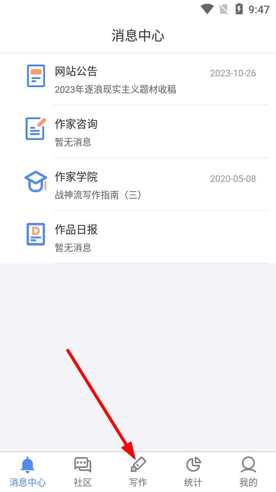 1、打開逐浪作家助手進入消息中心頁面,點擊底部導航欄的寫作選項。