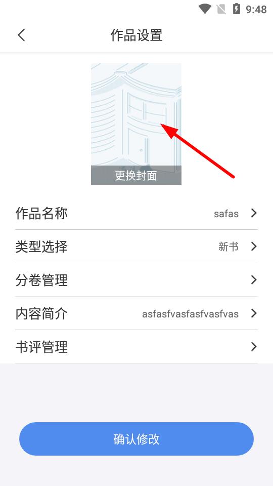 3、在作品設置頁面,可以點擊更換封面修改作品封面,或點擊作品名稱、類型選擇、內(nèi)容簡介選項進行對應內(nèi)容的修改。